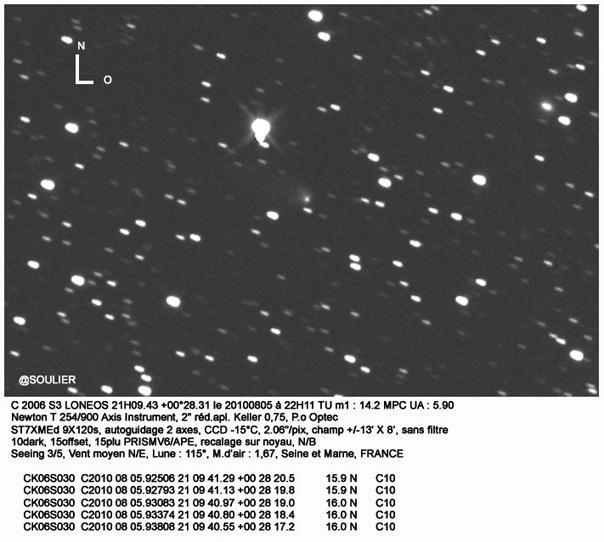 (Copyright Jean-Francois Soulier)Nuclear magnitude (m2) 15.9 m2 standard deviation 0.1 Aperture radius used for m2 8 " r (dist/Sun) 6.880 AU d (dist/Earth) 5.908 AU Right ascension 21 09 41.29 h m s Declination +00 28 20.5 ° ' " MPC report COD C10