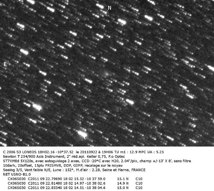 (Copyright Jean-Francois Soulier)Nuclear magnitude (m2) 15 m2 standard deviation 0.1 Aperture radius used for m2 8 " r (dist/Sun) 5.366 AU d (dist/Earth) 5.235 AU Right ascension 18 02 15.52 h m s Declination -10 37 59.0 ° ' " MPC report COD C10