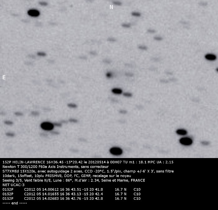 (Copyright Jean-Francois Soulier)Nuclear magnitude (m2) 16.7 Aperture radius used for m2 7.5 " r (dist/Sun) 3.131 AU d (dist/Earth) 2.153 AU Right ascension 16 36 43.51 h m s Declination -15 20 41.8 ° ' " MPC report COD C10