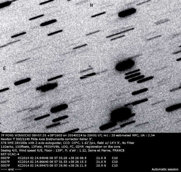 (Copyright Jean-Francois Soulier)Nuclear magnitude (m2) 21 m2 standard deviation 0.1 Aperture radius used for m2 6.5 " r (dist/Sun) 3.405 AU d (dist/Earth) 2.546 AU Right ascension 08 57 33.28 h m s Declination +38 26 08.9 ° ' " MPC report COD C10