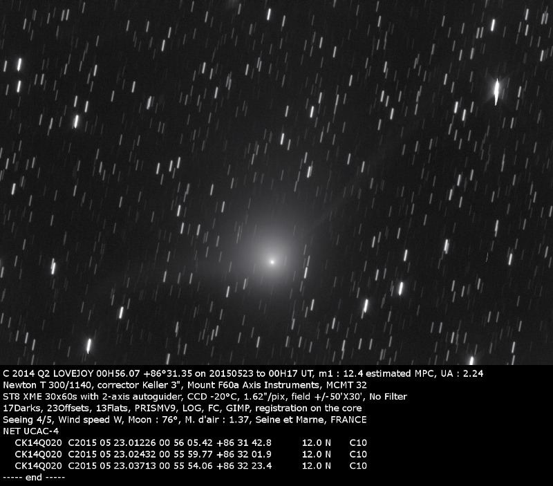 (Copyright Jean-Francois Soulier)Nuclear magnitude (m2) 12 Aperture radius used for m2 9.7 " r (dist/Sun) 2.073 AU d (dist/Earth) 2.244 AU Right ascension 00 56 05.42 h m s Declination +86 31 42.8 ° ' " MPC report COD C10