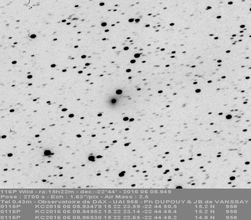 (Copyright Philippe Dupouy)Nuclear magnitude (m2) 15.1 m2 standard deviation 0.2 Aperture radius used for m2 4.9 " r (dist/Sun) 2.417 AU d (dist/Earth) 1.452 AU Right ascension 15 22 23.59 h m s Declination -22 44 50.5 ° ' " MPC report COD 958