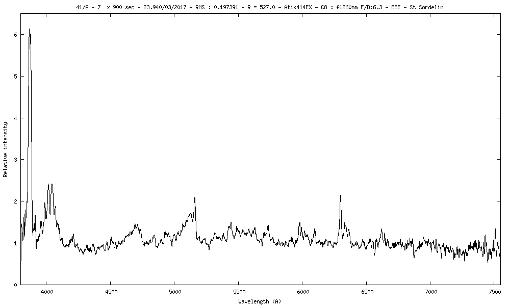 (Copyright Etienne Bertrand)Spectrum .fit Download Spectrum resolution 527 dL/L r (dist/Sun) 1.470 AU d (dist/Earth) 0.505 AU Instrument C8 reducteur 0.63 Instrument type Schmidt-Cassegrain Instrument aperture (0=naked eye) 200 mm Instrument focale length 1260 mm Instrument focale/diameter 6.3 Spectrometer Alpy Camera Atik 414EX Sensor CCD Sensor pixels number 1392x1040 Sensor temperature -10 °C Binning 1x1 Mount NEQ6 Autoguide Yes Exposure total time 6327 s Location Vaux Sur Mer Used softwares ISIS Image processing ISIS Observation submission date 2017 Mar 24 01h05m47s