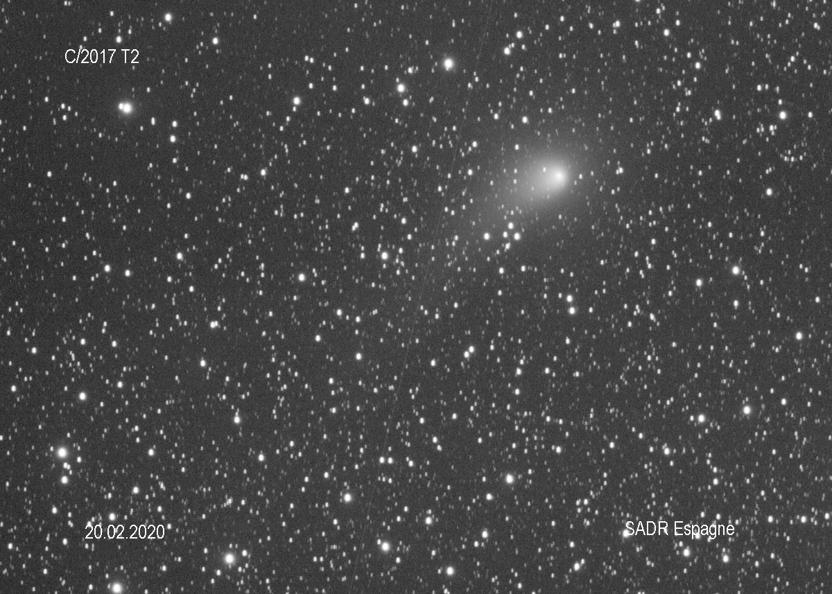 (Copyright Jean-Paul Desgrees)Nuclear magnitude (m2) 12.9 Aperture radius used for m2 7 " r (dist/Sun) 1.899 AU d (dist/Earth) 1.709 AU Instrumental configuration Config1 Instrument Takahashi TSA 120 Instrument type Refractor Instrument aperture (0=naked eye) 120 mm Instrument focale length 840 mm Instrument focale/diameter 7 Filter(s) L Camera QHY163M Sensor CCD Sensor size 17.7x13.4 mm2 Sensor pixels number 4579x3500 Sensor temperature -20 °C Binning 1x1 Mount AZ EQ6 Motorization Yes Autoguide Yes Exposure total time 15 s Observatory MPC code XXX Reference stars catalog UCAC-4 Used softwares ASTROMETRICA Image resize factor 0.9 Image processing non Observation submission date 2020 Feb 22 09h57m24s Observation modification date 2020 Feb 22 10h06m53s