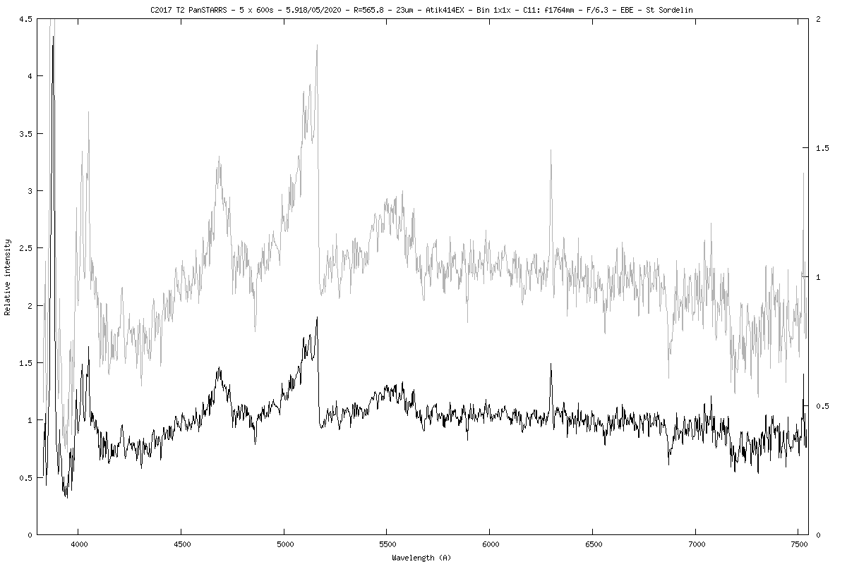 (Copyright Etienne Bertrand)Spectrum .fit Download Spectrum picture sampling (scale) 3.17 Å/pix Spectrum resolution 565.8 dL/L r (dist/Sun) 1.615 AU d (dist/Earth) 1.694 AU Right ascension 07 12 14.55 h m s Declination +76 13 11.0 ° ' " Instrument C11 Instrument type Schmidt-Cassegrain Instrument aperture (0=naked eye) 280 mm Instrument focale length 1764 mm Instrument focale/diameter 6.3 Spectrometer Alpy Camera ATIK 414 EX Sensor CCD Sensor pixels number 1391 x 1091 Sensor temperature -10 °C Binning 1x1 Mount NEQ6 Pro Autoguide Yes Exposure total time 3000 s Exposure details 5 x 600s Location Vaux Sur Mer Used softwares ISIS Observation submission date 2020 May 06 02h16m22s