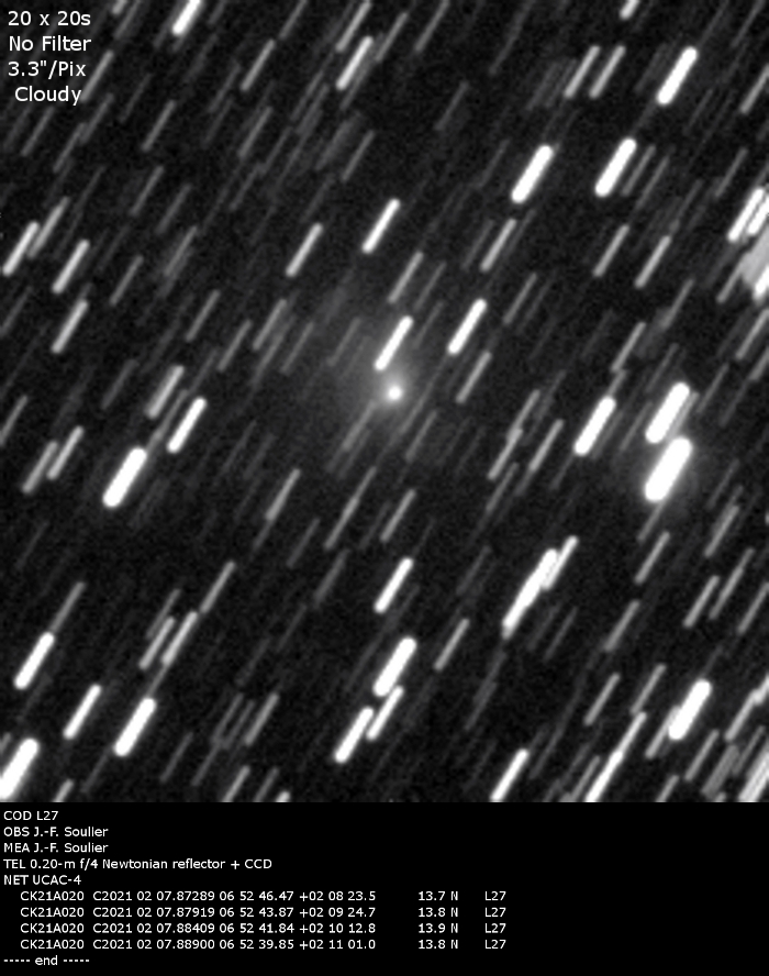 CK21A020 C2021 02 07.87289 06 52 46.47 +02 08 23.5 13.7 N L27