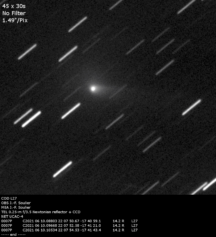 (Copyright Jean-Francois Soulier)Nuclear magnitude (m2) 14.2 m2 standard deviation 0.0 Aperture radius used for m2 7.45 " r (dist/Sun) 1.246 AU d (dist/Earth) 0.442 AU Right ascension 22 07 50.67 h m s Declination -17 40 59.1 ° ' " MPC report COD L27