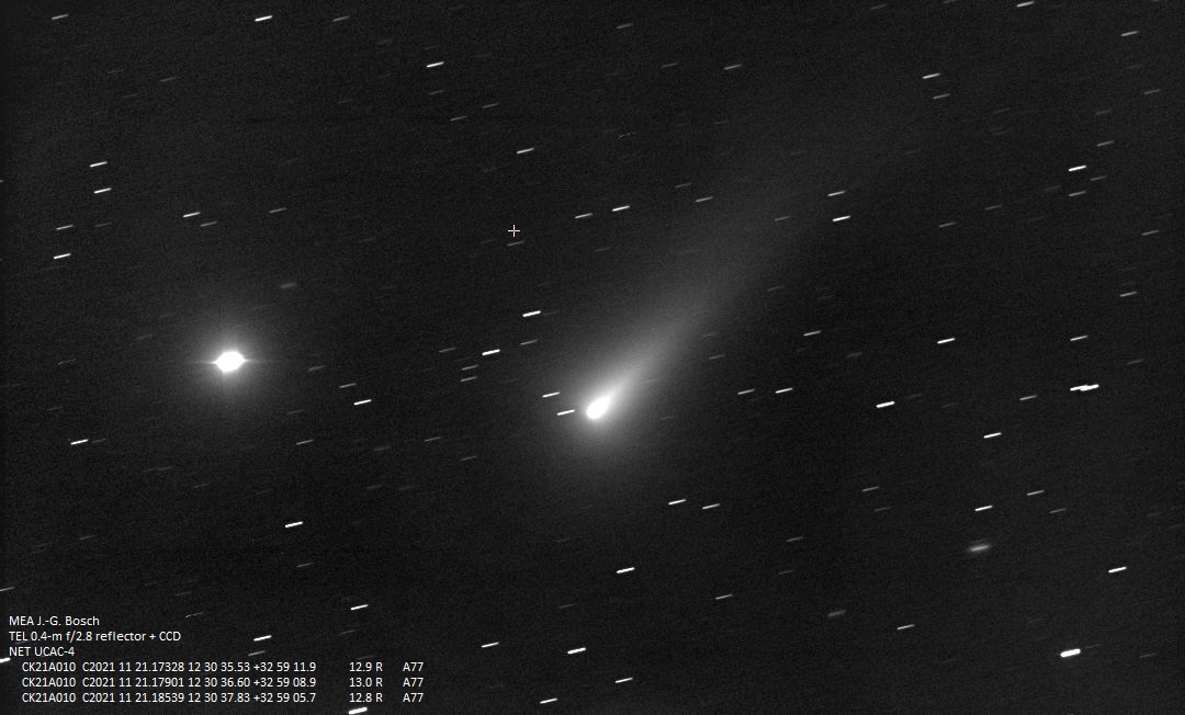 (Copyright Jean-Gabriel Bosch)Coma Total magnitude (m1) 10.3 Nuclear magnitude (m2) 12.9 m2 standard deviation 0.1 Aperture radius used for m2 5.8 " r (dist/Sun) 1.082 AU d (dist/Earth) 0.881 AU Right ascension 12 30 35.53 h m s Declination +32 59 11.9 ° ' " MPC report COD A77