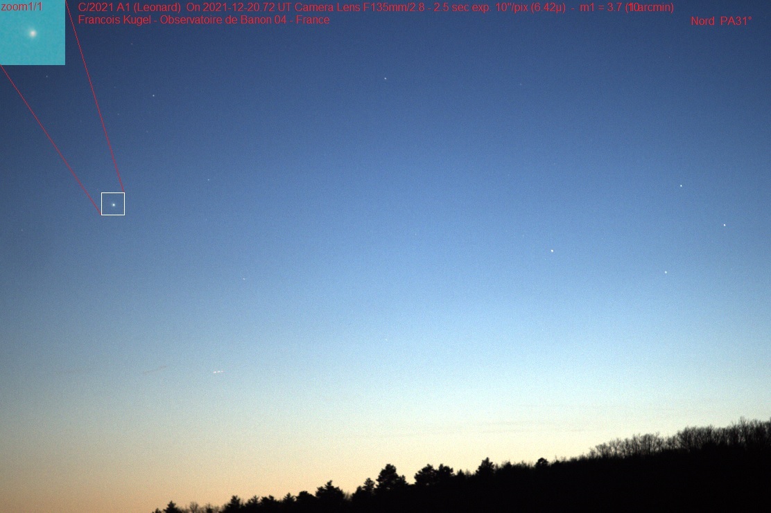 (Copyright Francois Kugel)Coma Total magnitude (m1) 3.7 Aperture radius used for m1 5 ' Coma diameter 10 ' r (dist/Sun) 0.689 AU d (dist/Earth) 0.387 AU Instrumental configuration Config7 Instrument type Camera lens Instrument aperture (0=naked eye) 55 mm Instrument focale length 135 mm Instrument focale/diameter 2.45 Filter(s) None Camera 350D Sensor DC Binning 1x1 Mount none Exposure details 1x2.5s Resulting picture sampling (scale) 10 "/pix Observation submission date 2021 Dec 20 20h14m40s Observation modification date 2021 Dec 21 14h57m26s