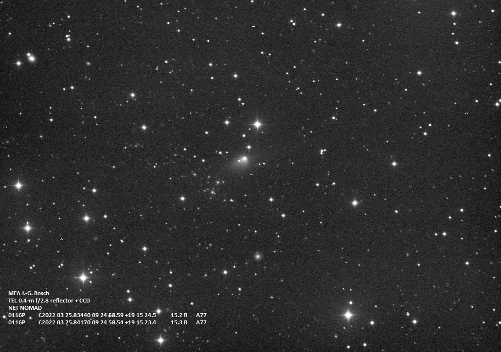 (Copyright Jean-Gabriel Bosch)Nuclear magnitude (m2) 15.3 m2 standard deviation 0.1 Aperture radius used for m2 5.8 " r (dist/Sun) 2.336 AU d (dist/Earth) 1.535 AU Right ascension 09 24 58.59 h m s Declination +19 15 24.5 ° ' " MPC report COD A77
