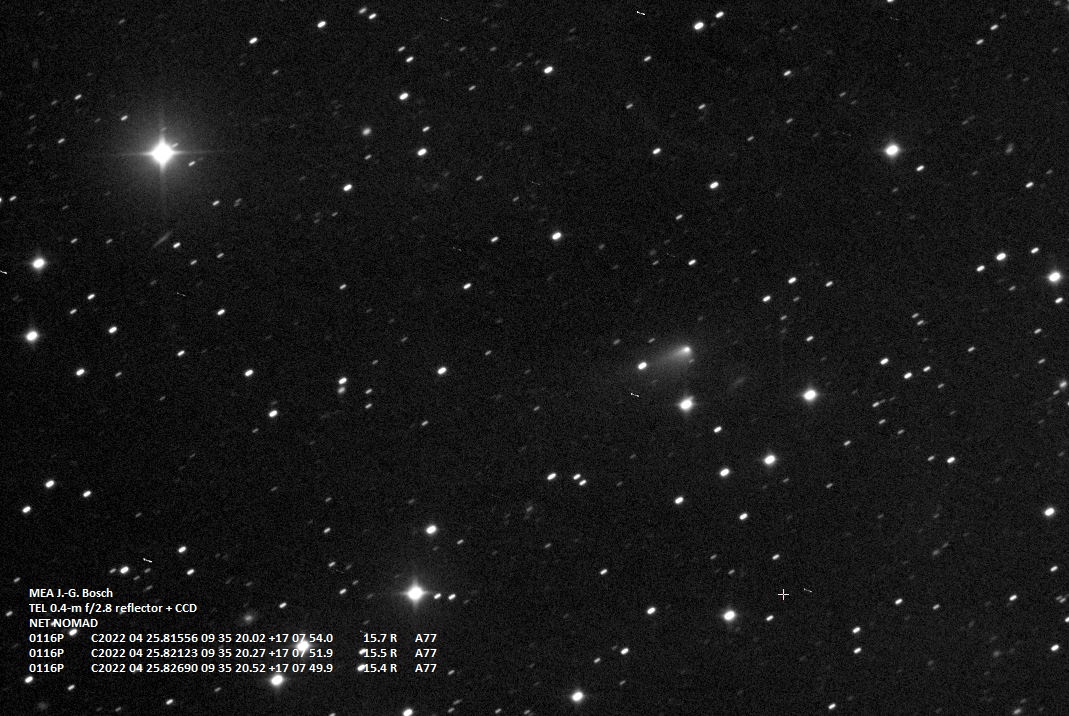 (Copyright Jean-Gabriel Bosch)Nuclear magnitude (m2) 15.5 m2 standard deviation 0.1 Aperture radius used for m2 5.8 " r (dist/Sun) 2.273 AU d (dist/Earth) 1.781 AU Right ascension 09 35 20.02 h m s Declination +17 07 54.0 ° ' " MPC report COD A77