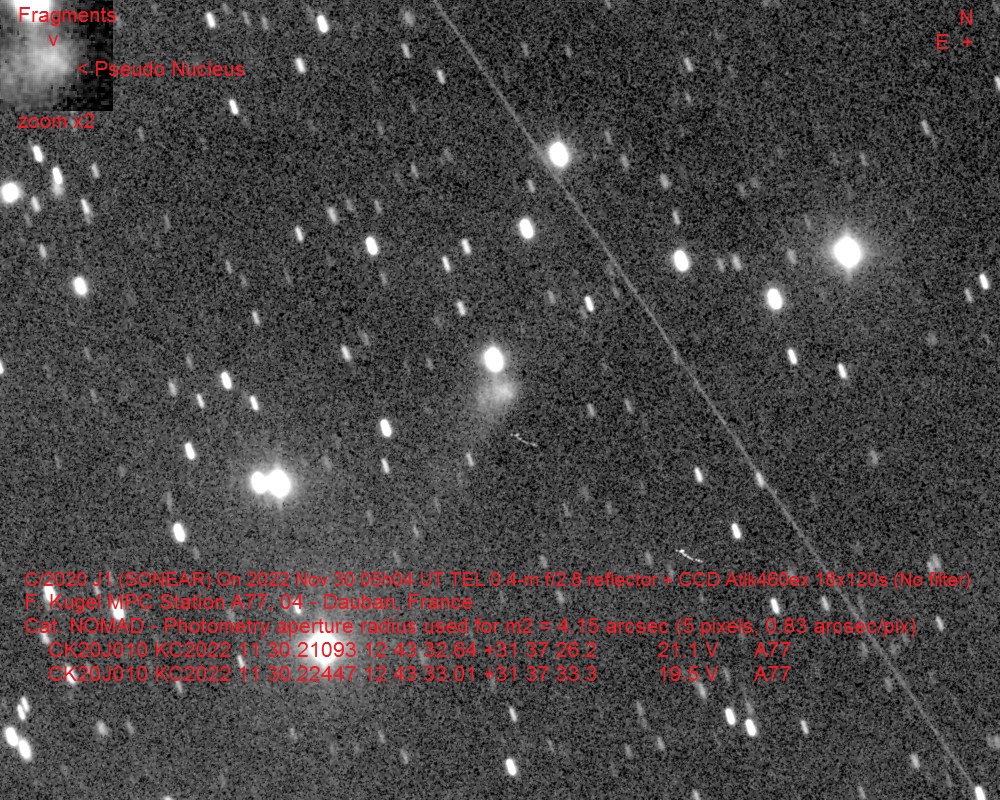 (Copyright Francois Kugel)Nuclear magnitude (m2) 20.3 m2 standard deviation 0.8 Aperture radius used for m2 5.8 " r (dist/Sun) 6.159 AU d (dist/Earth) 6.346 AU Right ascension 12 43 32.64 h m s Declination +31 37 26.2 ° ' " MPC report COD A77