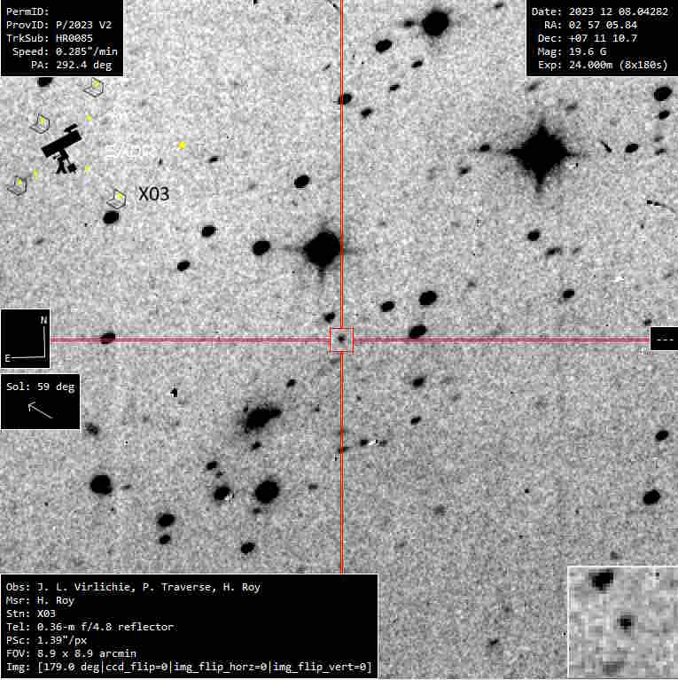 (Copyright Herve Roy)Nuclear magnitude (m2) 18.5 m2 standard deviation 0.1 Aperture radius used for m2 5.6 " r (dist/Sun) 3.516 AU d (dist/Earth) 2.859 AU Right ascension 01 39 19.98 h m s Declination +22 24 16.5 ° ' " MPC report COD X03