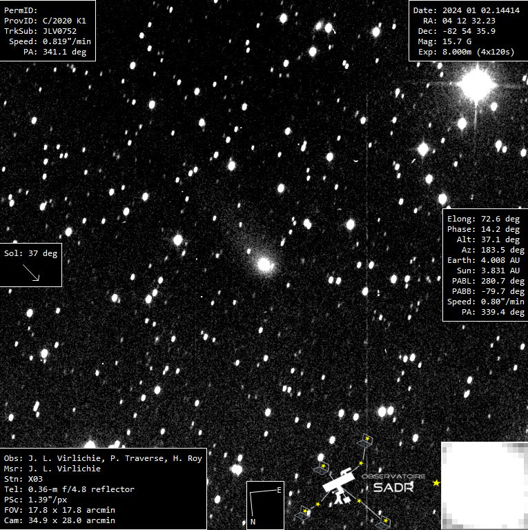 (Copyright Jean-Louis Virlichie)Nuclear magnitude (m2) 15.8 m2 standard deviation 0.1 Aperture radius used for m2 5.6 " r (dist/Sun) 3.830 AU d (dist/Earth) 4.008 AU Right ascension 04 12 32.23 h m s Declination -82 54 35.9 ° ' " MPC report COD X03