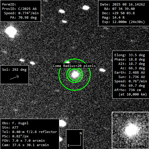 (Copyright Francois Kugel)Nuclear magnitude (m2) 14.2 m2 standard deviation 0.3 Aperture radius used for m2 5.8 " Afrho 513 cm Afrho error 70 cm Afrho URL for more info Tycho Right ascension 07 34 39.08 h m s Declination +29 50 02.5 ° ' " MPC report COD A77