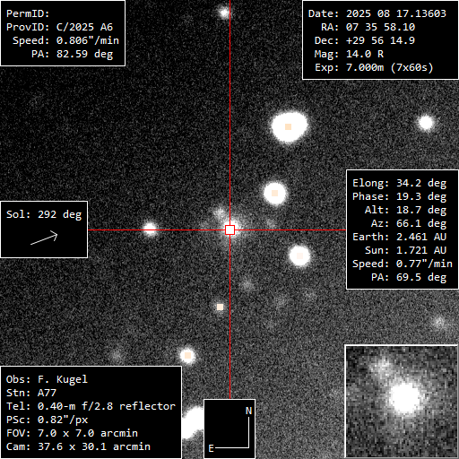 (Copyright Francois Kugel)Nuclear magnitude (m2) 13.9 m2 standard deviation 0.1 Aperture radius used for m2 5.8 " Afrho 517 cm Right ascension 07 35 57.60 h m s Declination +29 56 14.1 ° ' " MPC report COD A77