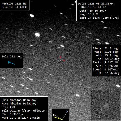(Copyright Nicolas Delaunoy)Nuclear magnitude (m2) 16.2 Aperture radius used for m2 6.1 " r (dist/Sun) 2.853 AU d (dist/Earth) 2.622 AU Right ascension 15 55 01.03 h m s Declination -15 36 36.7 ° ' " Instrumental configuration Config1 Instrument UNISTELLAR eQuinox2 Instrument type Newton Instrument aperture (0=naked eye) 115 mm Instrument focale length 450 mm Instrument focale/diameter 3.91 Filter(s) None Camera IMX347 Sensor CMOS Sensor size 7.1x5.3 mm2 Sensor pixels number 2088x1536 Binning 1x1 Mount ALT-AZ Motorization Yes Autoguide No Exposure total time 1076 s Exposure details 269*4s Sky transparency (naked eye max mag) 3.5 Seeing 3 Moon phase 162 ° Moon elongation 108 ° Location Yerres, 91330, France Reference stars catalog UCAC-4 Used softwares Tycho tracker (master darks avec Siril) Resulting picture sampling (scale) 1.33 "/pix Remarks or comments Pas évidente cette comète pour moi, basse et avec la pollution lumineuse ambiante. Observation submission date 2025 Aug 22 19h39m41s