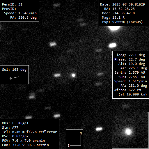 (Copyright Francois Kugel)Nuclear magnitude (m2) 15.1 m2 standard deviation 0.1 Aperture radius used for m2 5.8 " r (dist/Sun) 2.576 AU d (dist/Earth) 2.582 AU Right ascension 15 32 28.65 h m s Declination -14 36 48.7 ° ' " MPC report COD A77