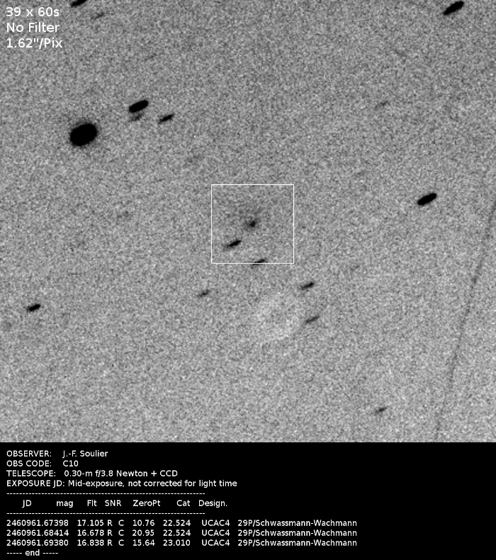 (Copyright Jean-Francois Soulier)Nuclear magnitude (m2) 17.2 m2 standard deviation 0.3 Aperture radius used for m2 6.5 " r (dist/Sun) 6.298 AU d (dist/Earth) 7.111 AU Right ascension 11 05 12.15 h m s Declination +01 24 36.3 ° ' " MPC report COD C10