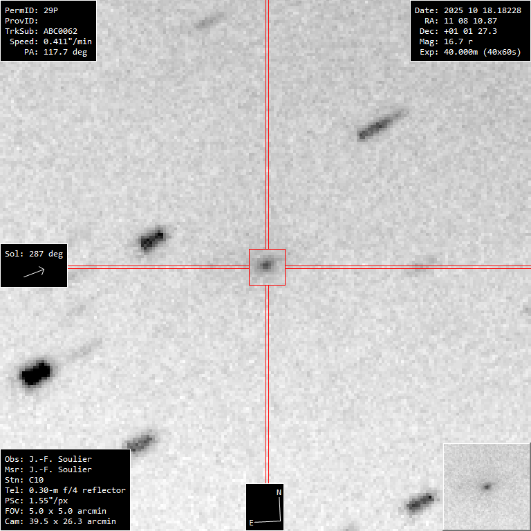 (Copyright Jean-Francois Soulier)Nuclear magnitude (m2) 16.7 m2 standard deviation 0.1 Aperture radius used for m2 6.2 " r (dist/Sun) 6.298 AU d (dist/Earth) 7.065 AU Right ascension 11 08 10.42 h m s Declination +01 01 31.3 ° ' " MPC report COD C10