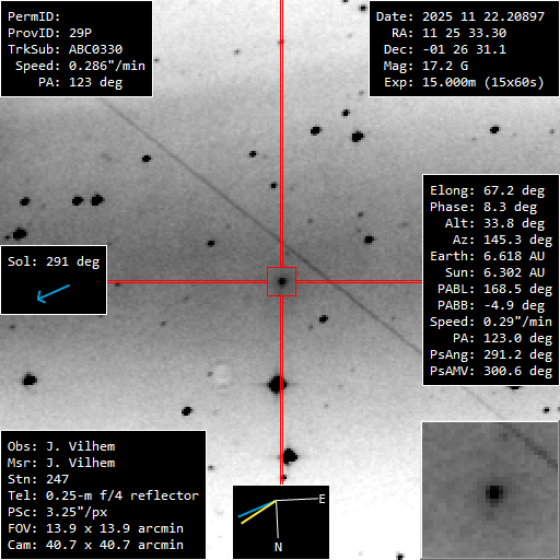 (Copyright Jonathan Vilhem)Nuclear magnitude (m2) 17.2 r (dist/Sun) 6.302 AU d (dist/Earth) 6.622 AU Right ascension 11 25 33.30 h m s Declination -01 26 31.1 ° ' " Instrument 250/1000 QUATTRO Instrument type Newton Instrument aperture (0=naked eye) 250 mm Instrument focale length 1000 mm Instrument focale/diameter 4 Filter(s) None Camera ASI 533 MM PRO Sensor CCD Sensor size 11.31X11.31 mm2 Sensor pixels number 3008X3008 Sensor temperature -10 °C Binning 4x4 Mount EQ6R PRO Motorization Yes Autoguide No Exposure total time 900 s Exposure details 15X60S Seeing 5 Location Saint Jean Rohrbach Moselle France Reference stars catalog Tycho Used softwares TYCHO Observation submission date 2025 Nov 22 09h56m37s