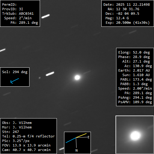 (Copyright Jonathan Vilhem)Nuclear magnitude (m2) 12.4 r (dist/Sun) 1.605 AU d (dist/Earth) 2.020 AU Right ascension 12 30 31.76 h m s Declination -02 04 09.5 ° ' " Instrument 250/1000 QUATTRO Instrument type Newton Instrument aperture (0=naked eye) 250 mm Instrument focale length 1000 mm Instrument focale/diameter 4 Filter(s) None Camera ASI 533 MM PRO Sensor CCD Sensor size 11.31X11.31 mm2 Sensor pixels number 3008X3008 Sensor temperature -10 °C Binning 4x4 Mount EQ6R PRO Motorization Yes Autoguide No Exposure total time 1230 s Exposure details 41X30S Seeing 5 Location Saint Jean Rohrbach Moselle France Reference stars catalog Tycho Used softwares TYCHO Observation submission date 2025 Nov 22 10h10m45s Observation modification date 2025 Nov 22 10h11m51s