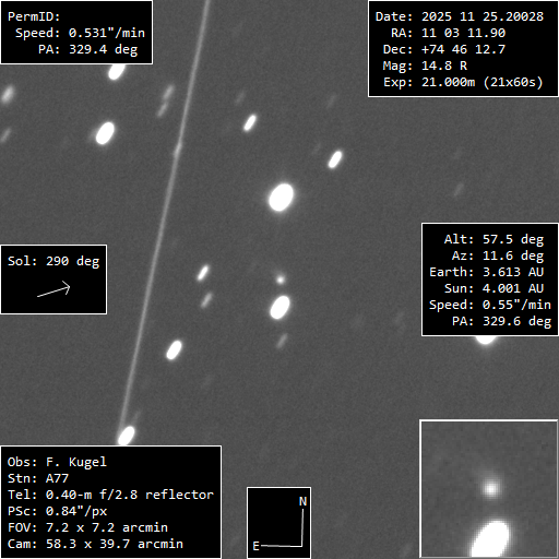 (Copyright Francois Kugel)Nuclear magnitude (m2) 14.8 m2 standard deviation 0.0 Aperture radius used for m2 5.95 " r (dist/Sun) 4.002 AU d (dist/Earth) 3.616 AU Right ascension 11 03 12.41 h m s Declination +74 46 09.3 ° ' " MPC report COD A77