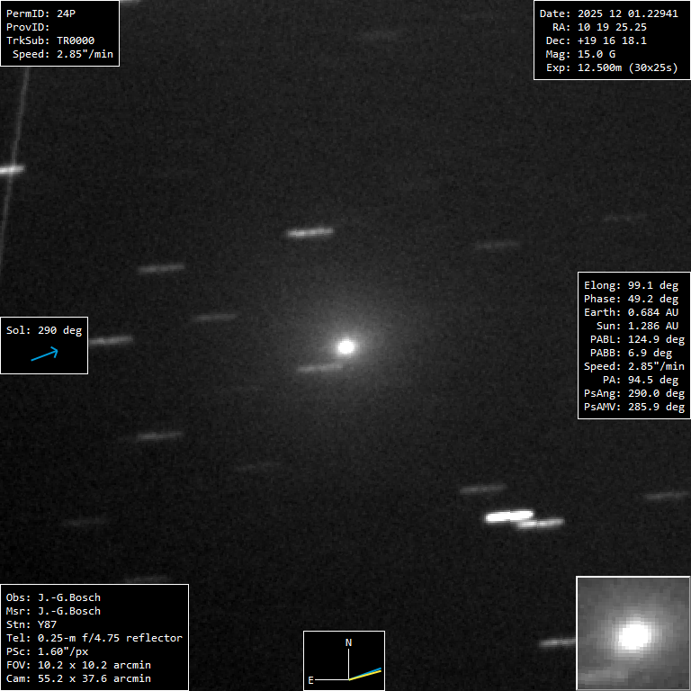 (Copyright Jean-Gabriel Bosch)Nuclear magnitude (m2) 15.1 m2 standard deviation 0.1 Aperture radius used for m2 6.4 " Coma diameter 2.8 ' r (dist/Sun) 1.287 AU d (dist/Earth) 0.685 AU Right ascension 10 19 24.27 h m s Declination +19 16 18.8 ° ' " MPC report COD Y87