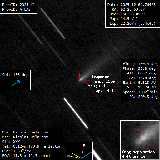 (Copyright Nicolas Delaunoy)r (dist/Sun) 1.379 AU d (dist/Earth) 0.518 AU Right ascension 02 25 53.67 h m s Declination +66 53 05.9 ° ' " Instrumental configuration Config1 Instrument UNISTELLAR eQuinox2 Instrument type Newton Instrument aperture (0=naked eye) 115 mm Instrument focale length 450 mm Instrument focale/diameter 3.91 Filter(s) None Camera IMX347 Sensor CMOS Sensor size 7.1x5.3 mm2 Sensor pixels number 2088x1536 Binning 1x1 Mount ALT-AZ Motorization Yes Autoguide Yes Exposure total time 1336 s Exposure details 334x4s Sky transparency (naked eye max mag) 3.5 Seeing 3 Moon phase 4 ° Moon elongation 45 ° Location Yerres, 91330, France Reference stars catalog UCAC-4 Used softwares Tycho tracker (master darks avec Siril) Resulting picture sampling (scale) 1.33 "/pix Remarks or comments Position du noyau indiqué par le JPL lors du traitement avec Tycho tracker - invisible avec mon instrument d'ou incertitude de la magnitude. Observation submission date 2025 Dec 08 22h05m05s Observation modification date 2025 Dec 08 22h06m48s