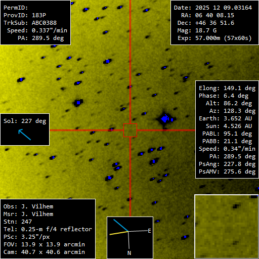(Copyright Jonathan Vilhem)Nuclear magnitude (m2) 18.7 r (dist/Sun) 4.526 AU d (dist/Earth) 3.652 AU Right ascension 06 40 08.15 h m s Declination +46 36 51.6 ° ' " Instrument 250/1000 QUATTRO Instrument type Newton Instrument aperture (0=naked eye) 250 mm Instrument focale length 1000 mm Instrument focale/diameter 4 Filter(s) None Camera ASI 533MM PRO Sensor CCD Sensor size 11.31X11.31 mm2 Sensor pixels number 3008X3008 Sensor temperature -10 °C Binning 4x4 Mount EQ6R PRO Motorization Yes Autoguide No Exposure total time 3420 s Exposure details 57X60S Seeing 2 Location Saint Jean Rohrbach Moselle France Reference stars catalog Tycho-2 Used softwares TYCHO Remarks or comments Quelques nuages passager Observation submission date 2025 Dec 09 18h41m47s