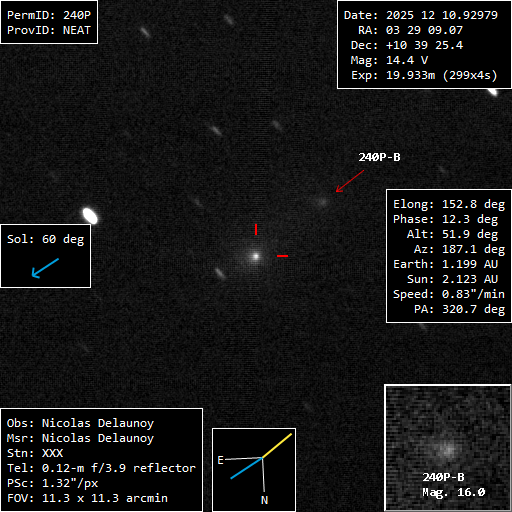 (Copyright Nicolas Delaunoy)Nuclear magnitude (m2) 14.4 Aperture radius used for m2 5.9 " r (dist/Sun) 2.123 AU d (dist/Earth) 1.195 AU Right ascension 03 29 09.07 h m s Declination +10 39 25.4 ° ' " Instrumental configuration Config1 Instrument UNISTELLAR eQuinox2 Instrument type Newton Instrument aperture (0=naked eye) 115 mm Instrument focale length 450 mm Instrument focale/diameter 3.91 Filter(s) None Camera IMX347 Sensor CMOS Sensor size 7.1x5.3 mm2 Sensor pixels number 2088x1536 Binning 1x1 Mount ALT-AZ Motorization Yes Autoguide No Exposure total time 1196 s Exposure details 299x4s Sky transparency (naked eye max mag) 3.5 Seeing 3 Moon phase 79 ° Moon elongation 105 ° Location Yerres, 91330, France Reference stars catalog UCAC-4 Used softwares Tycho tracker (master darks avec Siril) Resulting picture sampling (scale) 1.32 "/pix Observation submission date 2025 Dec 11 17h06m16s