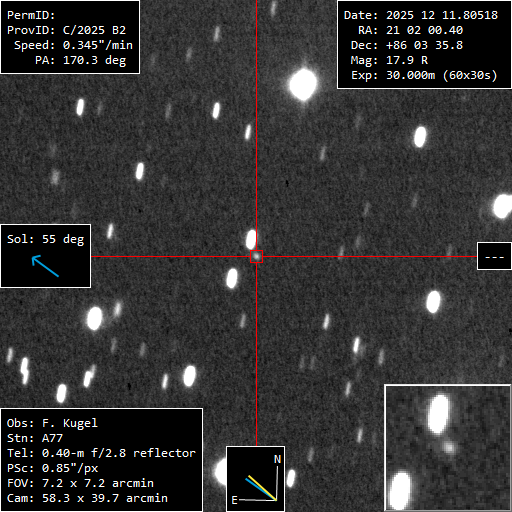 (Copyright Francois Kugel)Nuclear magnitude (m2) 17.9 m2 standard deviation 0.2 Aperture radius used for m2 5.95 " r (dist/Sun) 8.402 AU d (dist/Earth) 8.000 AU Right ascension 21 01 59.78 h m s Declination +86 03 39.7 ° ' " MPC report COD A77
