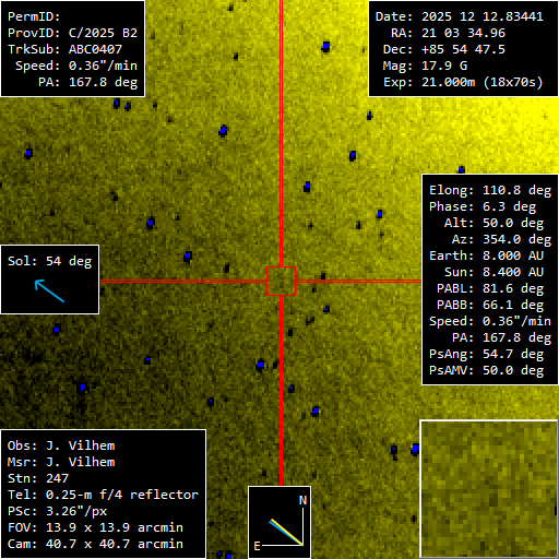 (Copyright Jonathan Vilhem)Nuclear magnitude (m2) 17.9 Right ascension 21 03 34.96 h m s Declination +85 54 47.5 ° ' " Instrument 250/1000 QUATTRO Instrument type Newton Instrument aperture (0=naked eye) 250 mm Instrument focale length 1000 mm Instrument focale/diameter 4 Filter(s) None Camera ASI 533MM PRO Sensor CMOS Sensor size 11.31X11.31 mm2 Sensor pixels number 3008X3008 Sensor temperature -10 °C Binning 4x4 Mount EQ6R PRO Motorization Yes Autoguide No Exposure total time 1260 s Exposure details 18X70SEC Seeing 2 Observatory MPC code 247 Location Saint Jean Rohrbach Moselle France Reference stars catalog Tycho-2 Used softwares Tycho Remarks or comments Léger brouillard Observation submission date 2025 Dec 12 22h33m23s
