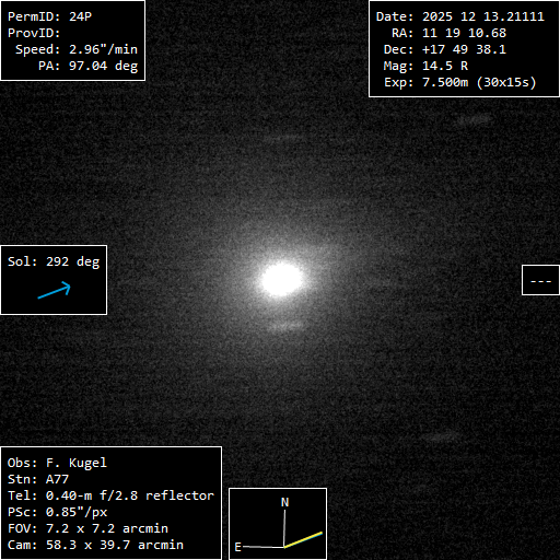 (Copyright Francois Kugel)Nuclear magnitude (m2) 14.5 m2 standard deviation 0.1 Aperture radius used for m2 5.95 " r (dist/Sun) 1.234 AU d (dist/Earth) 0.629 AU Right ascension 11 19 10.03 h m s Declination +17 49 39.3 ° ' " MPC report COD A77