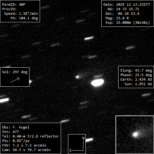 (Copyright Francois Kugel)Nuclear magnitude (m2) 15.8 m2 standard deviation 0.1 Aperture radius used for m2 5.95 " r (dist/Sun) 1.850 AU d (dist/Earth) 2.434 AU Right ascension 14 33 15.13 h m s Declination -06 26 21.1 ° ' " MPC report COD A77