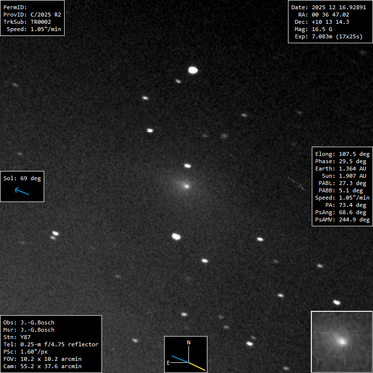 (Copyright Jean-Gabriel Bosch)Nuclear magnitude (m2) 16.8 m2 standard deviation 0.5 Aperture radius used for m2 6.4 " r (dist/Sun) 1.893 AU d (dist/Earth) 1.340 AU Right ascension 00 36 46.85 h m s Declination +10 13 13.4 ° ' " MPC report COD Y87