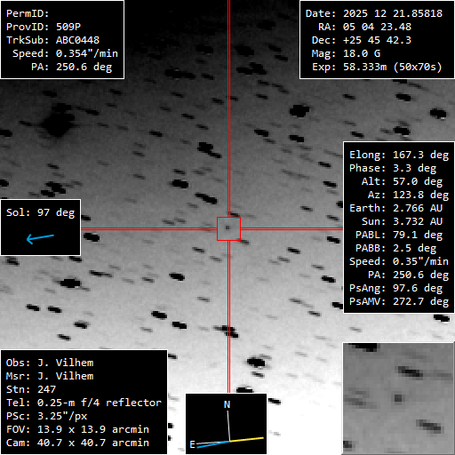 (Copyright Jonathan Vilhem)Nuclear magnitude (m2) 18.0 r (dist/Sun) 3.733 AU d (dist/Earth) 2.765 AU Right ascension 05 04 23.48 h m s Declination +25 45 42.3 ° ' " Instrument 250/1000 QUATTRO Instrument type Newton Instrument aperture (0=naked eye) 250 mm Instrument focale length 1000 mm Instrument focale/diameter 4 Filter(s) None Camera ASI 533MM PRO Sensor CMOS Sensor size 11.31X11.31 mm2 Sensor pixels number 3008X3008 Sensor temperature -10 °C Binning 4x4 Mount EQ6R PRO Motorization Yes Autoguide No Exposure total time 3500 s Exposure details 50X70SEC Sky transparency (naked eye max mag) 3 Seeing 2 Observatory MPC code 247 Location Saint Jean Rohrbach Moselle France Reference stars catalog APASS Used softwares TYCHO Remarks or comments Leger vent + passage nuageux Observation submission date 2025 Dec 22 09h03m51s