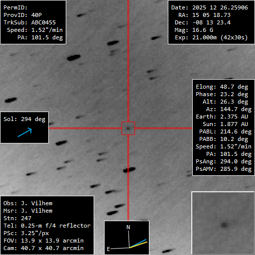 (Copyright Jonathan Vilhem)Nuclear magnitude (m2) 16.6 r (dist/Sun) 1.877 AU d (dist/Earth) 2.376 AU Right ascension 15 05 18.73 h m s Declination -08 13 23.4 ° ' " Instrumental configuration Config5 Instrument 250/1000 QUATTRO Instrument type Newton Instrument aperture (0=naked eye) 250 mm Instrument focale length 1000 mm Instrument focale/diameter 4 Filter(s) None Camera ASI 533MM PRO Sensor CMOS Sensor size 11.31X11.31 mm2 Sensor pixels number 3008X3008 Sensor temperature -10 °C Binning 4x4 Mount EQ6R PRO Motorization Yes Autoguide No Exposure total time 1260 s Exposure details 42X30SEC Seeing 3 Observatory MPC code 247 Location Saint Jean Rohrbach Moselle France Reference stars catalog APASS Used softwares TYCHO Remarks or comments LEGER VENT Observation submission date 2025 Dec 26 11h12m16s
