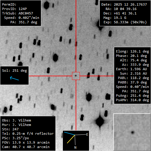 (Copyright Jonathan Vilhem)Nuclear magnitude (m2) 19.1 r (dist/Sun) 2.317 AU d (dist/Earth) 1.598 AU Right ascension 10 04 39.16 h m s Declination +61 41 36.1 ° ' " Instrumental configuration Config5 Instrument 250/1000 QUATTRO Instrument type Newton Instrument aperture (0=naked eye) 250 mm Instrument focale length 1000 mm Instrument focale/diameter 4 Filter(s) None Camera ASI 533MM PRO Sensor CMOS Sensor size 11.31X11.31 mm2 Sensor pixels number 3008X3008 Sensor temperature -10 °C Binning 4x4 Mount EQ6R PRO Motorization Yes Autoguide No Exposure total time 3500 s Exposure details 50X70SEC Seeing 3 Observatory MPC code 247 Location Saint Jean Rohrbach Moselle France Reference stars catalog APASS Used softwares TYCHO Remarks or comments LEGER VENT Observation submission date 2025 Dec 26 11h16m32s