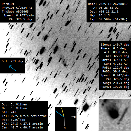 (Copyright Jonathan Vilhem)Nuclear magnitude (m2) 16.1 Right ascension 08 28 38.02 h m s Declination +54 11 21.1 ° ' " Instrumental configuration Config5 Instrument 250/1000 QUATTRO Instrument type Newton Instrument aperture (0=naked eye) 250 mm Instrument focale length 1000 mm Instrument focale/diameter 4 Filter(s) None Camera ASI 533MM PRO Sensor CMOS Sensor size 11.31X11.31 mm2 Sensor pixels number 3008X3008 Sensor temperature -10 °C Binning 4x4 Mount EQ6R PRO Motorization Yes Autoguide No Exposure total time 3560 s Exposure details 51X70SEC Seeing 3 Observatory MPC code 247 Location Saint Jean Rohrbach Moselle France Reference stars catalog APASS Used softwares TYCHO Remarks or comments LEGER VENT Observation submission date 2025 Dec 26 11h25m02s