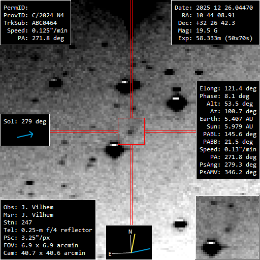 (Copyright Jonathan Vilhem)Nuclear magnitude (m2) 19.5 Right ascension 10 44 08.91 h m s Declination +32 26 42.3 ° ' " Instrumental configuration Config5 Instrument 250/1000 QUATTRO Instrument type Newton Instrument aperture (0=naked eye) 250 mm Instrument focale length 1000 mm Instrument focale/diameter 4 Filter(s) None Camera ASI 533MM PRO Sensor CMOS Sensor size 11.31X11.31 mm2 Sensor pixels number 3008X3008 Sensor temperature -10 °C Binning 4x4 Mount EQ6R PRO Motorization Yes Autoguide No Exposure total time 3500 s Exposure details 50X70SEC Seeing 3 Observatory MPC code 247 Location Saint Jean Rohrbach Moselle France Reference stars catalog APASS Used softwares TYCHO Remarks or comments LEGER VENT Observation submission date 2025 Dec 26 11h26m58s