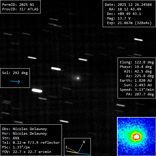 (Copyright Nicolas Delaunoy)Nuclear magnitude (m2) 13.7 Aperture radius used for m2 6.11 " r (dist/Sun) 2.486 AU d (dist/Earth) 1.818 AU Right ascension 10 12 43.49 h m s Declination +09 49 43.1 ° ' " Instrumental configuration Config1 Instrument UNISTELLAR eQuinox2 Instrument type Newton Instrument aperture (0=naked eye) 115 mm Instrument focale length 450 mm Instrument focale/diameter 3.91 Filter(s) None Camera IMX347 Sensor CMOS Sensor size 7.1x5.3 mm2 Sensor pixels number 2088x1536 Binning 1x1 Mount ALT-AZ Motorization Yes Autoguide No Exposure total time 1312 s Exposure details 328x4s Sky transparency (naked eye max mag) 3.5 Seeing 3 Moon phase 109 ° Moon elongation 163 ° Location Yerres, 91330, France Reference stars catalog UCAC-4 Used softwares Tycho tracker (master darks avec Siril) Resulting picture sampling (scale) 1.33 "/pix Observation submission date 2025 Dec 27 17h27m12s