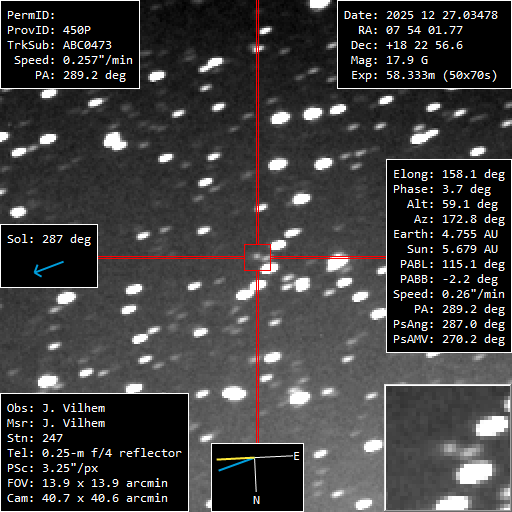 (Copyright Jonathan Vilhem)Nuclear magnitude (m2) 17.9 r (dist/Sun) 5.679 AU d (dist/Earth) 4.755 AU Right ascension 07 54 01.77 h m s Declination +18 22 56.6 ° ' " Instrumental configuration Config5 Instrument 250/1000 QUATTRO Instrument type Newton Instrument aperture (0=naked eye) 250 mm Instrument focale length 1000 mm Instrument focale/diameter 4 Filter(s) None Camera ASI 533MM PRO Sensor CMOS Sensor size 11.31X11.31 mm2 Sensor pixels number 3008X3008 Sensor temperature -10 °C Binning 4x4 Mount EQ6R PRO Motorization Yes Autoguide No Exposure total time 3500 s Exposure details 50X70SEC Seeing 3 Observatory MPC code 247 Location Saint Jean Rohrbach Moselle France Reference stars catalog APASS Used softwares TYCHO Remarks or comments LEGER VENT Observation submission date 2025 Dec 27 20h32m53s