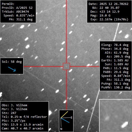 (Copyright Jonathan Vilhem)Nuclear magnitude (m2) 19.0 Right ascension 22 40 35.07 h m s Declination +23 14 12.9 ° ' " Instrumental configuration Config5 Instrument 250/1000 QUATTRO Instrument type Newton Instrument aperture (0=naked eye) 250 mm Instrument focale length 1000 mm Instrument focale/diameter 4 Filter(s) None Camera ASI 533MM PRO Sensor CMOS Sensor size 11.31X11.31 mm2 Sensor pixels number 3008X3008 Sensor temperature -10 °C Binning 4x4 Mount EQ6R PRO Motorization Yes Autoguide No Exposure total time 1330 s Exposure details 19X70SEC Seeing 3 Observatory MPC code 247 Location Saint Jean Rohrbach Moselle France Reference stars catalog APASS Used softwares TYCHO Remarks or comments LEGER VENT Observation submission date 2025 Dec 27 20h35m19s