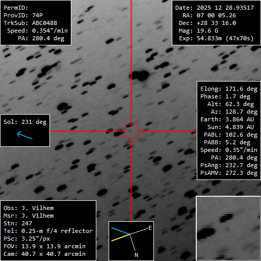 (Copyright Jonathan Vilhem)Nuclear magnitude (m2) 19.6 r (dist/Sun) 4.839 AU d (dist/Earth) 3.866 AU Right ascension 07 00 05.26 h m s Declination +28 33 16.0 ° ' " Instrumental configuration Config5 Instrument 250/1000 QUATTRO Instrument type Newton Instrument aperture (0=naked eye) 250 mm Instrument focale length 1000 mm Instrument focale/diameter 4 Filter(s) None Camera ASI 533MM PRO Sensor CMOS Sensor size 11.31X11.31 mm2 Sensor pixels number 3008X3008 Sensor temperature -10 °C Binning 4x4 Mount EQ6R PRO Motorization Yes Autoguide No Exposure total time 3290 s Exposure details 47X70SEC Seeing 4 Observatory MPC code 247 Location Saint Jean Rohrbach Moselle France Reference stars catalog APASS Used softwares TYCHO Observation submission date 2025 Dec 29 09h16m27s