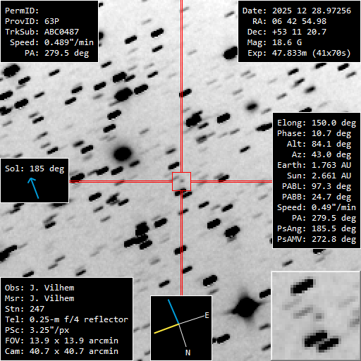 (Copyright Jonathan Vilhem)Nuclear magnitude (m2) 18.6 r (dist/Sun) 2.666 AU d (dist/Earth) 1.769 AU Right ascension 06 42 54.98 h m s Declination +53 11 20.7 ° ' " Instrumental configuration Config5 Instrument 250/1000 QUATTRO Instrument type Newton Instrument aperture (0=naked eye) 250 mm Instrument focale length 1000 mm Instrument focale/diameter 4 Filter(s) None Camera ASI 533MM PRO Sensor CMOS Sensor size 11.31X11.31 mm2 Sensor pixels number 3008X3008 Sensor temperature -10 °C Binning 4x4 Mount EQ6R PRO Motorization Yes Autoguide No Exposure total time 2870 s Exposure details 41X70SEC Seeing 4 Observatory MPC code 247 Location Saint Jean Rohrbach Moselle France Reference stars catalog APASS Used softwares TYCHO Observation submission date 2025 Dec 29 09h18m58s