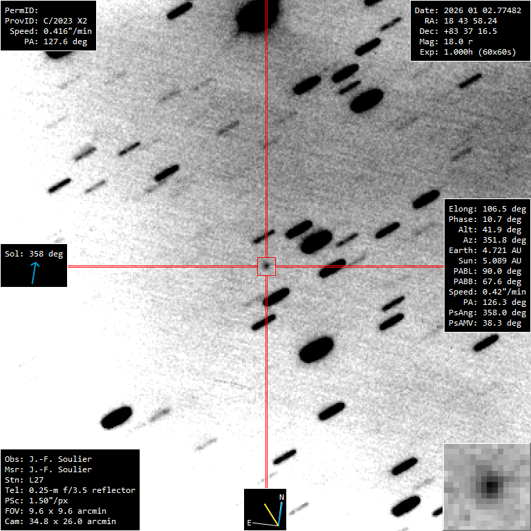 (Copyright Jean-Francois Soulier)Nuclear magnitude (m2) 18.1 m2 standard deviation 0.1 Aperture radius used for m2 6.75 " r (dist/Sun) 5.089 AU d (dist/Earth) 4.719 AU Right ascension 18 43 54.08 h m s Declination +83 37 22.1 ° ' " MPC report COD L27
