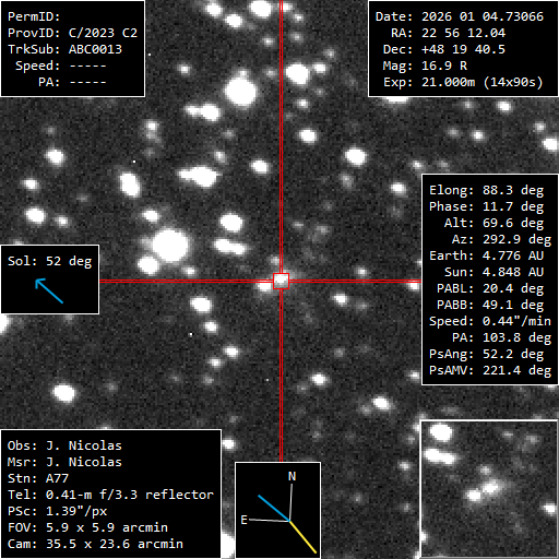 (Copyright Joel Nicolas)Nuclear magnitude (m2) 16.9 m2 standard deviation 0.3 Aperture radius used for m2 5.6 " r (dist/Sun) 4.843 AU d (dist/Earth) 4.764 AU Right ascension 22 56 11.56 h m s Declination +48 19 41.9 ° ' " MPC report COD A77