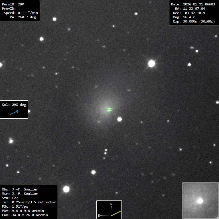 (Copyright Jean-Francois Soulier)Nuclear magnitude (m2) 16.7 m2 standard deviation 0.1 Aperture radius used for m2 6.75 " r (dist/Sun) 6.307 AU d (dist/Earth) 5.691 AU Right ascension 11 33 07.64 h m s Declination -03 42 09.6 ° ' " MPC report COD L27
