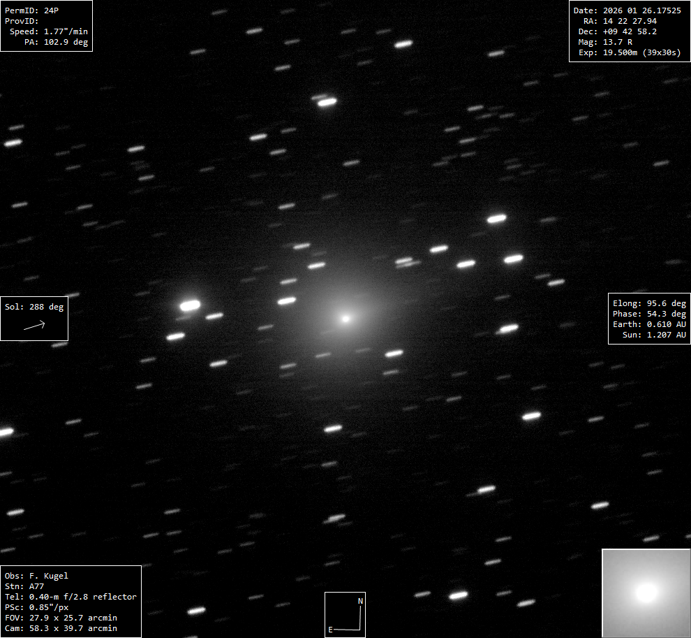 (Copyright Francois Kugel)Nuclear magnitude (m2) 13.7 m2 standard deviation 0.1 Aperture radius used for m2 5.95 " r (dist/Sun) 1.207 AU d (dist/Earth) 0.610 AU Right ascension 14 22 27.15 h m s Declination +09 43 01.5 ° ' " MPC report COD A77